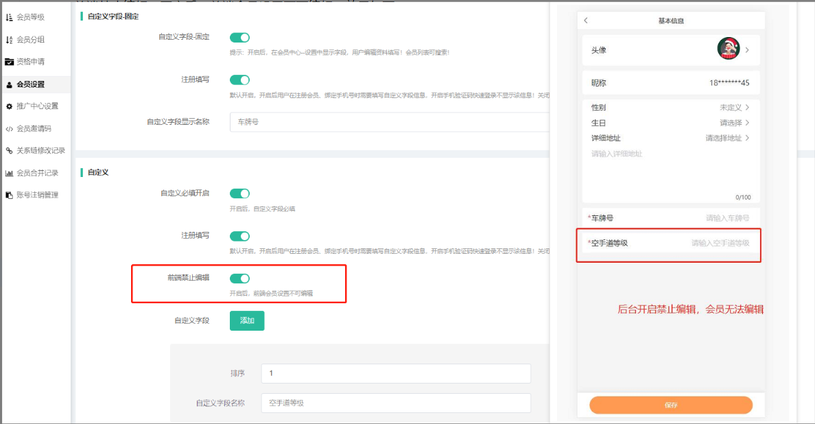 前端禁止编辑:开启后,前端会员设置不可编辑。效果如下