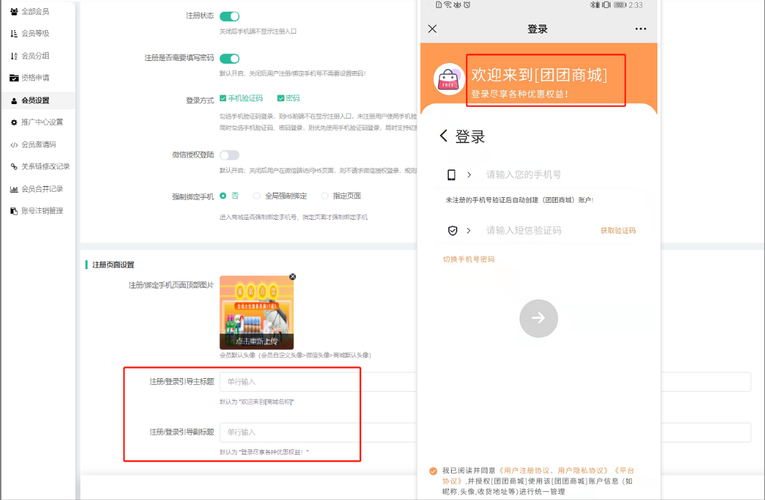 勾选手机验证码登录,则H5前端不在显示注册入口,未注册用户使用手机验证码登录即可完成注册+登录操作。