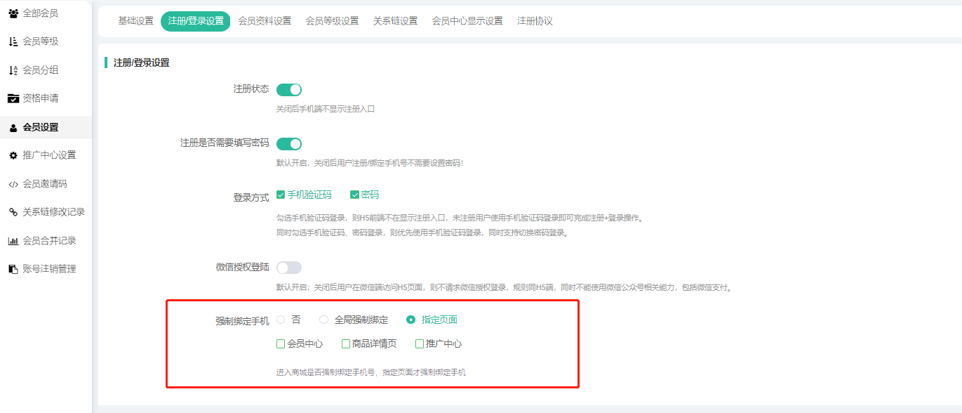 如果开启,用户进入商品详情页,会员中心等页面需要验证是否绑定手机号,如果没有,则跳转手机号绑定页面;开启本功能前,请确认已经设置短信功能。