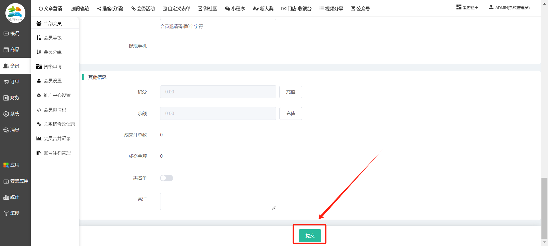 目录 搜索 展开 一、前期准备资料二、数字乡村码-上线操作指南1、服务号的申请流程及认证2、申请小程序流程3、开放平台绑定小程序和公众号三、数字乡村码-系统操作数字乡村码系统管理-概况数字乡村码-商品管理1、发布商品2、商品列表3、商品表单4、商品分类5、品牌管理6、配送模板7、评论管理8、优惠券管理9、商品标签10、退货地址设置11、满额优惠12、批量操作13、配送方式14、基础设置15、商品隐藏四、数字乡村码-会员管理1、全部会员2、会员等级3、会员分组4、资格申请5、会员设置6、推广中心设置7、会员邀请码8、会员关系链修改关系链修改记录9、会员合并记录10、账号注销管理11、会员设置中心五、数字乡村码-订单管理1、订单管理列表2、订单处理流程3、订单状态4、订单修改价格5、订单退款退货6、多包裹发货7、批量发货订单操作步骤8、催发货订单9、物流查询六、数字乡村码-财务管理1、余额设置2、会员余额3、充值记录4、转让记录5、余额明细6、收入明细7、提现设置8、提现统计9、积分管理10、转账审核11、收益广告12、批量充值七、数字乡村码-系统管理1、商城入口2、商城设置①、商城设置②、订单设置③、物流查询④、短信⑤、联系方式⑥、分类⑦、优惠券⑧、分享⑨、幻灯片⑩、广告位⑫、地图设置3、交易设置4、微信模板消息自定义消息模板(新版)自定义消息模板(旧版)小程序消息模板公众号模板消息变更公告5、语言设置6、权限管理7、多媒体管理八、数字乡村码-消息管理九、数字乡村码-应用管理十、数字乡村码系统-数据统计十一、数字乡村码-页面装修DIY1、模板管理2、店铺页面3、顶部导航4、底部导航5、DIY模板市场6、首屏广告7、基础设置8、装修DIY尺寸建议十二、供应商功能插件操作指南1、供应商2、门店-收银台门店申请和使用步骤门店管理①、门店-收银台 营销设置②、门店-收银台 分润设置门店分类门店申请门店审核门店商品门店商品订单收银台订单数据统计核销员基础设置默认设置门店装修3、微社区4、会务活动十三、营销插件操作指南活动报名提货卡新人奖微店问卷调查积分视频分享1、视频分享基础设置2、视频分享发现管理3、视频分享分类管理4、视频分享评论管理5、视频分享分红记录6、视频分享短视频中心每日红包幸运大抽奖签到优惠券二维码任务奖励优惠劵文章音频文章付费文章限时购新海报拓客卡操作流程积分活动素材中心视频红包十四、入驻门店应用类1、门店预约2、附近商品3、门店定位设置4、门店控制5、门店满额包邮6、门店满额减7、导入商品8、门店搜索9、门店股东10、核销券11、多门店核销1、商城后台设置2、前端功能演示十五、常见问题1、后台登录密码修改流程2、会员-余额,积分,后台如何进行充值与扣除3、如何修改上下级关系4、一种万能的获取商城小程序路径的方法 暂无相关搜索结果! 阅读次数:1422 本文档使用 模王系统 发布 8、会员关系链修改 8、会员关系链修改一.如何修改上下级关系?1.会员-全部会员-可以通过搜索用户的独立ID,或者用户微信昵称,找到此会员,然后点击右边的(操作)2.再点击会员详情。3.滑到下面,有个推广信息-会员上线,点击修改4.输入上级的ID号,点击搜索,出来此上级会员后点击选择。5.滑到最下面,一定要点击提交按钮。文档更新时间: 2023-11-30 14:56 作者:链上旅行