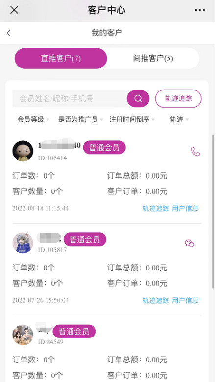 利用客户中心功能,会员可以掌握直推和间推客户的喜好动向,持续让他们买买买,以此来获得更多的收益轨迹追踪 推荐客户详情查看 全方位跟进客户动态。支持微信端、小程序端,若需要轨迹追踪,要搭配“浏览轨迹”插件使用!