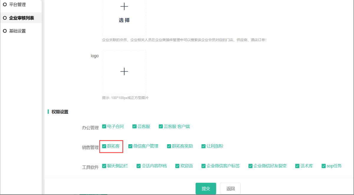 2、后台--应用--群拓客如果开启后只有企业管理平台--基础设置中和平台绑定的企业可以使用群拓客功能!