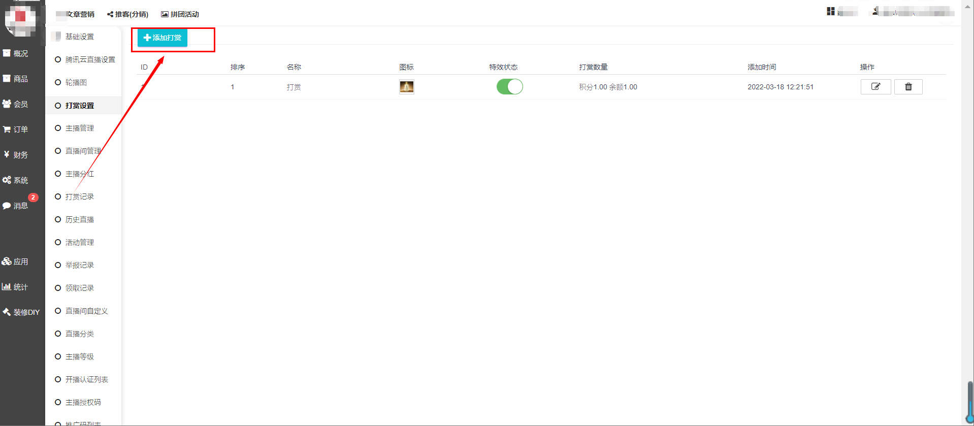 备注:打赏主播,可以在平台后台打赏设置先设置好打赏内容,比如特效、打赏金额等设置。